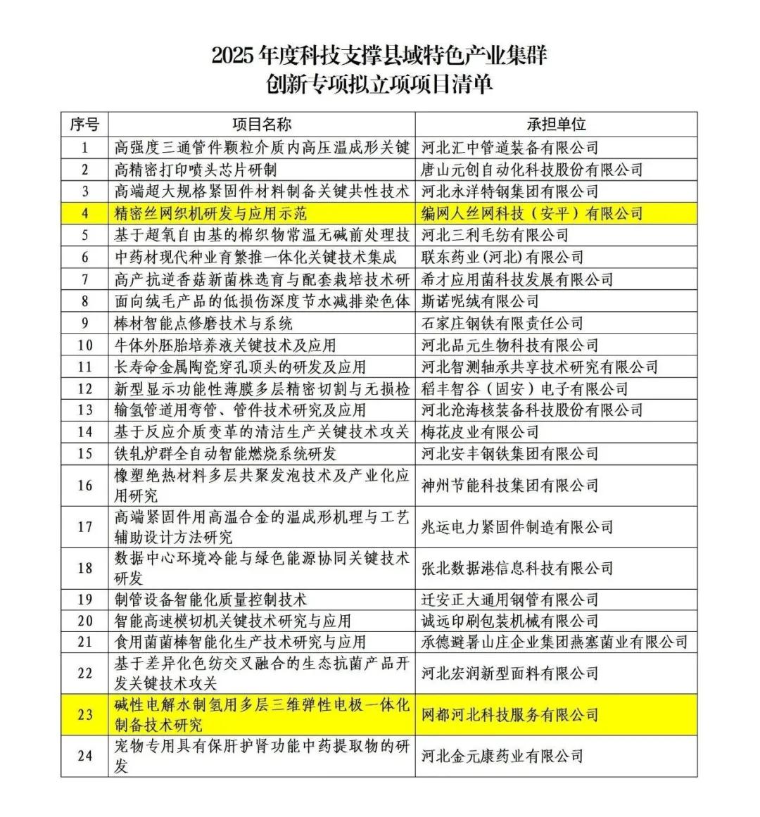 据安平发布微信公众号消息,12月1日,河北省科技厅对2025年度科技支撑县域特色产业集群“创新专项项目”进行了公示,国盛(安平)丝网集团有限公司、编网人丝网科技(安平)有限公司承担的项目成功入选,为衡水市仅有的两个入选项目,将开展高精密织机、电解水制氢等领域关键技术难题攻关,争取省科技专项资金支持,进一步推动科技创新和产业创新深度融合。